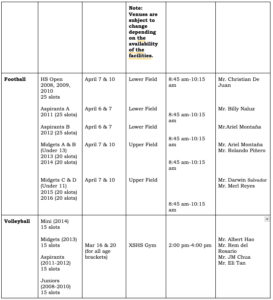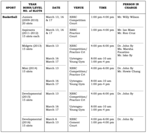 The final tryout results will be posted on the bulletin board outside the Athletics Office after the summer training. For other sports, tryouts will be held in the early part of SY 2026-2027.