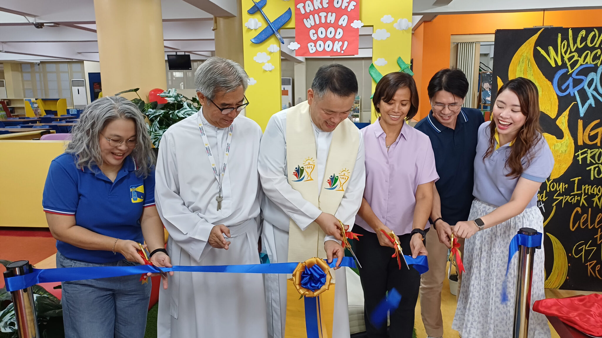 Fr. Joseph Haw, S.J., School President, led the blessing ceremony and ribbon-cutting, accompanied by Ms. Tess Elizalde, Campus Operations Director; Mrs. Jane Cacacho, Principal; Fr. Arnulfo Bugtas, Jr., S.J., Chaplain for Adult Formation; Mr. Jay Perez, Assistant Principal for Academics; and Ms. Anniela dela Cruz, LRC Coordinator.Â