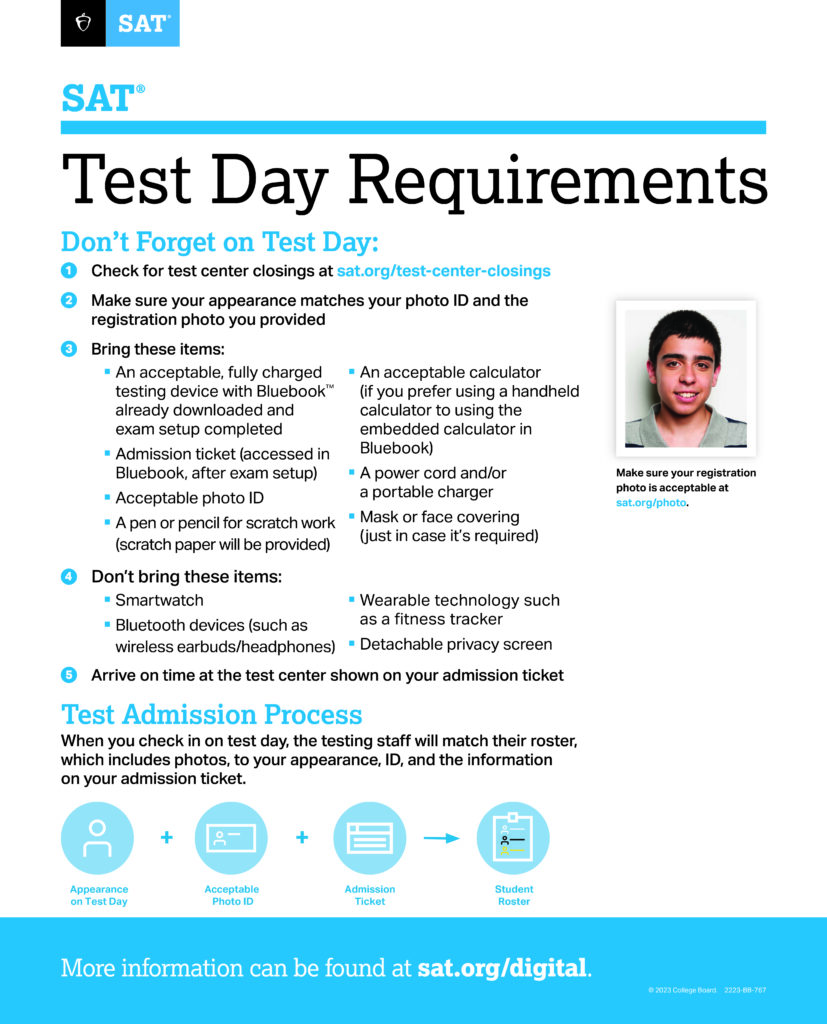 REMINDERS: Please be reminded that once you register, you’ll need to take these steps to get ready for test day. The earlier you download the SAT digital testing app, Bluebook™, the more time you’ll have to prepare by taking a full-length practice test and studying with Official Digital SAT Prep on Khan Academy®.